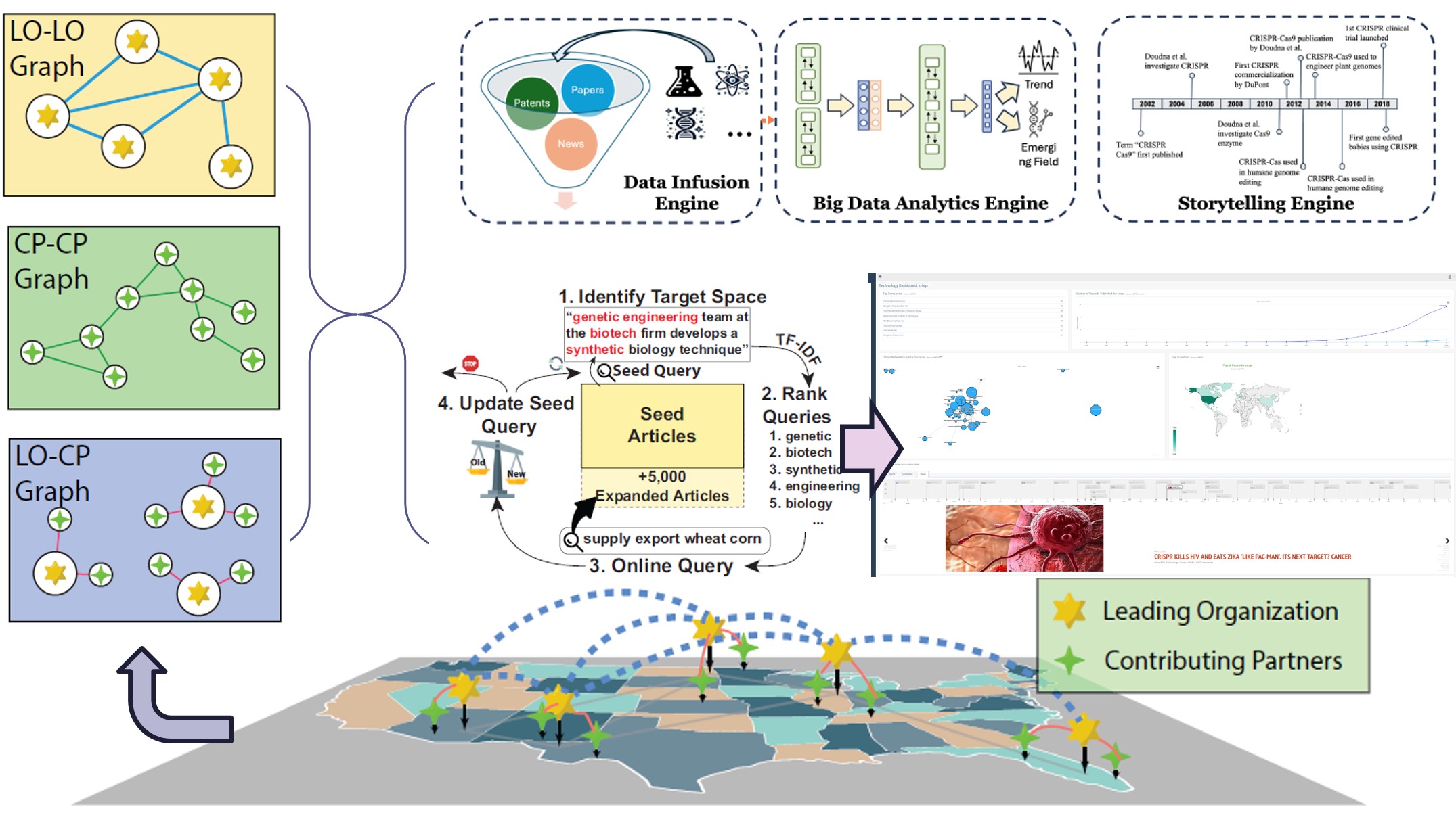 This proposal encompasses three primary initiatives: 1) Forecasting Emergence in Science and Technology (S&T) Areas Using Multimodal Machine Learning: This involves leveraging machine learning to assess the potential of various technology areas evolving from earlystage experimental concepts to transformative research products with wide-ranging applications. 2) Evaluating the Societal and Economic Impact of Leading Research Organizations Regionally with Deep Graph Neural Networks: Utilizing geolocation data and historical research collaboration records, this objective introduces an innovative approach using graph neural networks. This method aims to model the science and technology trends of leading organizations and their societal and economic impacts at regional and national levels. 3) A Data-Driven Hybrid Approach to Monitor Workforce Development Demographics: This proposal suggests combining interactive, data-driven methods with traditional data collection techniques to track the career development of individuals involved in these technology areas. The research goals outlined in this proposal are inherently interdisciplinary, requiring seamless collaboration among Computer Scientists, Sociologists, and Economists. The developed technical approaches will make significant research contributions to the fields of spatial data mining, graph neural networks and S&T trends and impact predictions and beneficial in light of the recent NSF Engines initiative.